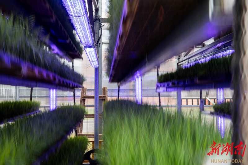 4月22日,湖南农业大学耘园立体育秧与设施综合利用大棚内,翠绿秧苗在纵向灯带的照射下长势旺盛。湖南日报全媒体记者 赵持 通讯员 青晓彤 摄影报道