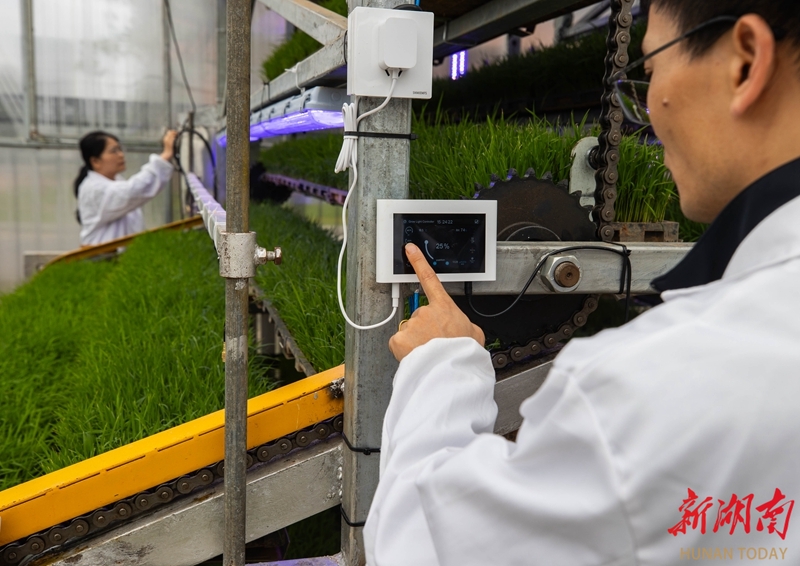 4月22日,湖南农业大学耘园立体育秧与设施综合利用大棚内,夏茂副教授科研团队正协同作业,观察秧苗长势与设备运行参数。湖南日报全媒体记者 赵持 通讯员 青晓彤 摄影报道