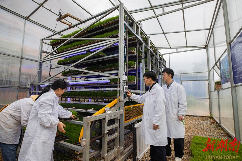 4月22日,湖南农业大学耘园立体育秧与设施综合利用大棚内,夏茂副教授(中)在察看秧苗的长势。湖南日报全媒体记者 赵持 通讯员 青晓彤 摄影报道