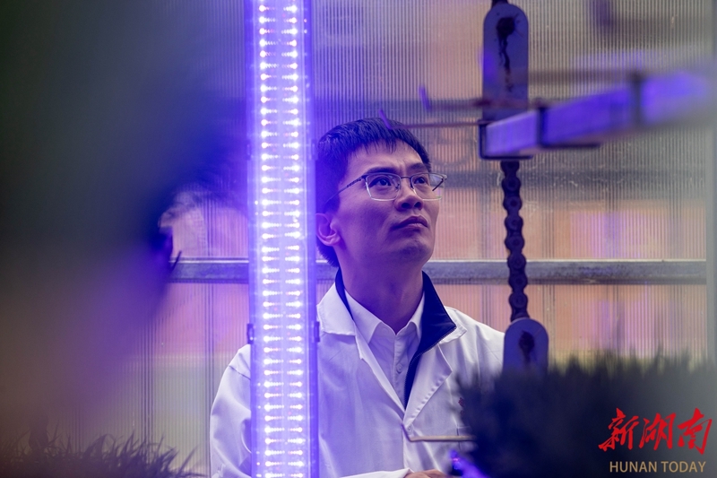 4月22日,湖南农业大学耘园立体育秧与设施综合利用大棚内,夏茂副教授在察看秧苗的长势。他带领的科研团队历时五年,成功研制出可调光谱补光设备,有效解决了湖南早春因光照不足导致的秧苗孱弱难题。该系统可适用于水稻、烟草、蔬菜等多种作物育苗,能将设施闲置期从8个月大幅缩短,实现了高效周年化生产。目前,该技术已在宁乡、岳阳、衡东等地试点,预计明年大面积推广。湖南日报全媒体记者 赵持 通讯员 青晓彤 摄影报道