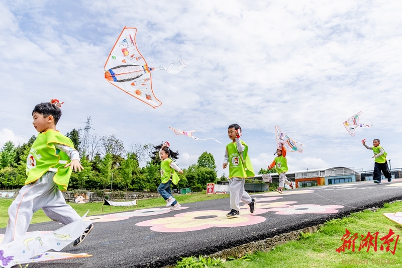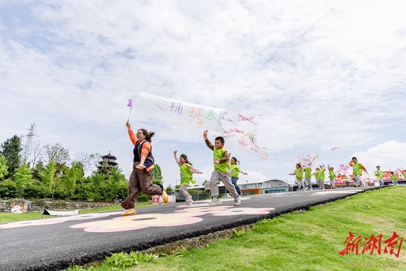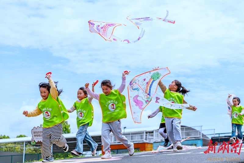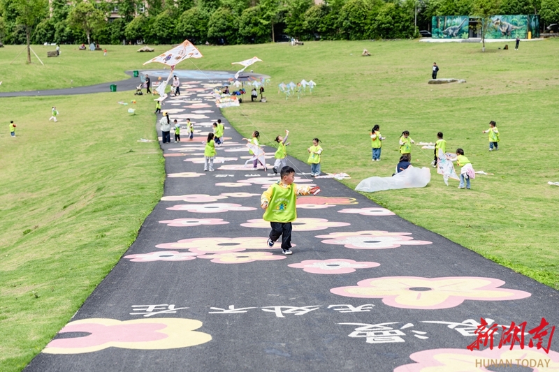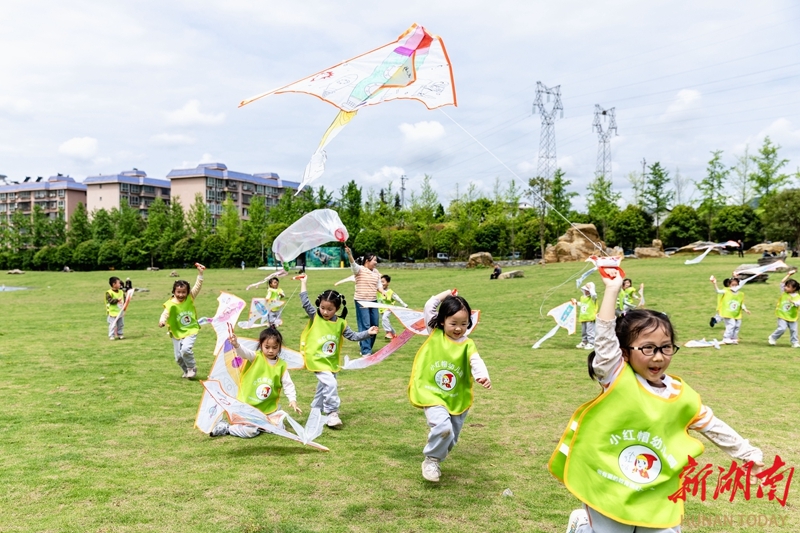 4月23日,吉首市乾州街道兔岩社区,幼儿园小朋友在绿地公园放飞风筝。当天,该市多所幼儿园开展“与春风同行 与纸鸢相伴”户外主题活动。孩子们在老师的带领下,发挥创意,手绘专属风筝,并体验放飞的乐趣,在奔跑与欢笑中感受春天的气息。彭璟 摄(湖南图片库)