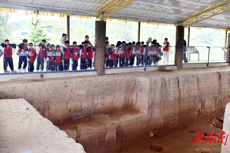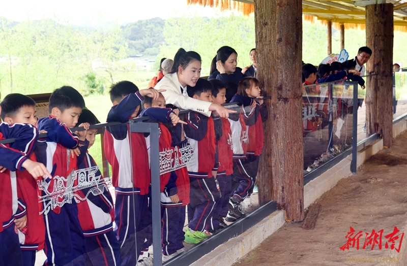 4月22日,洪江市岔头乡岩里村的高庙遗址博物馆,一批中小学生开展主题研学活动。高庙遗址是一处典型的新石器时期贝丘遗址,遗存年代距今约7800年至5300年。这里出土了中国迄今最早的白陶遗存,陶器上以戳印篦点技法刻画的凤鸟纹、獠牙兽面纹。湖南日报全媒体记者 田超 摄