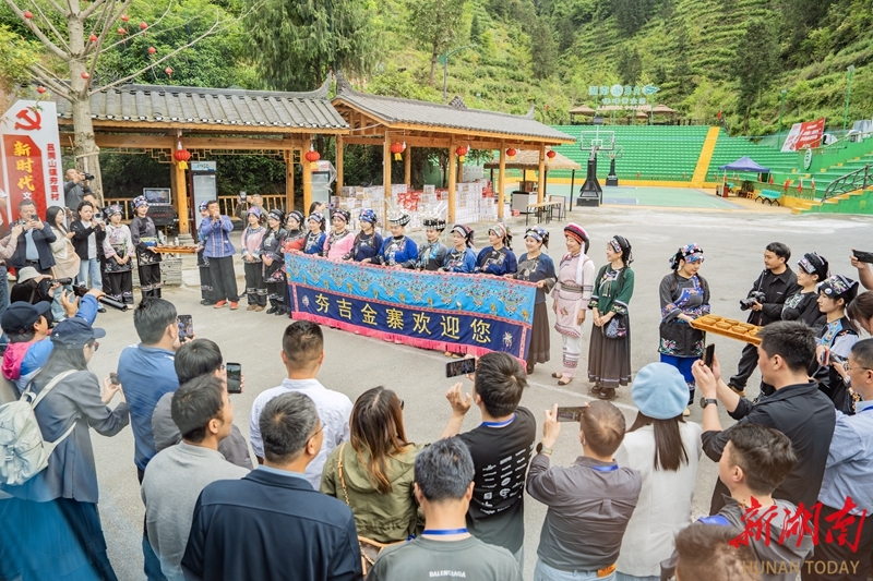 4月23日,保靖县吕洞山镇夯吉村,身着苗族特色服饰的村民以歌舞盛宴热情欢迎到来的客人。该村落位于吕洞山南麓峡谷地带,民居依山脊呈鱼鳞状分布,现存425栋木结构建筑占比超95%,形成“九龙夺宝”建筑景观,其气势堪比贵州西江千户苗寨。 湖南日报全媒体记者 李健 摄