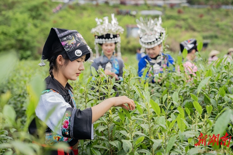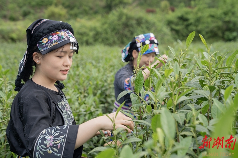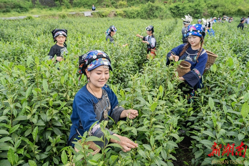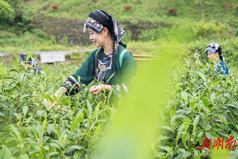 4月23日,保靖县富怡茶园,茶农在采摘保靖黄金茶。保靖黄金茶依托武陵山区优良生态环境和优良品质享誉市场,成为当地的特色支柱产业,融合苗族民俗文化与生态茶产业发展,有效推动农文旅深度结合。 湖南日报全媒体记者 李健 摄