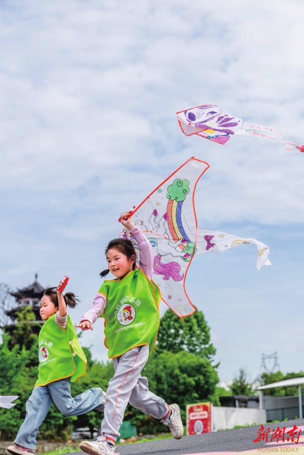 4月23日,湘西土家族苗族自治州吉首市乾州街道兔岩社区,小朋友在放风筝。当天,该市多所幼儿园开展“与春风同行 与纸鸢相伴”户外主题活动。