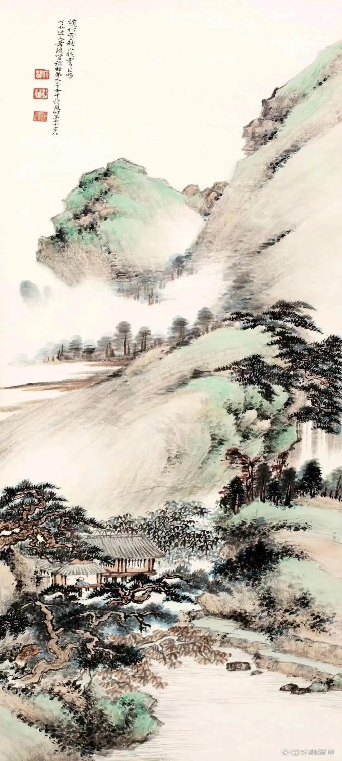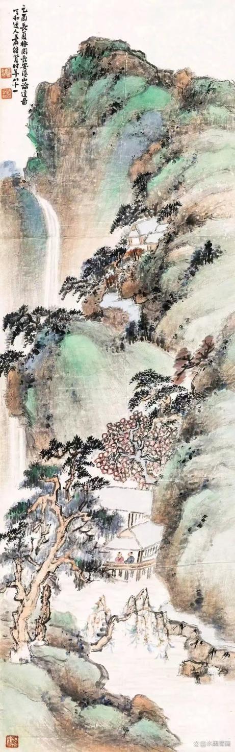 其三在心源。晚年隐居沪上,门墙高峻。施南池三请乃得入室,可见重品格过于技法。笔墨日趋简淡,青绿创没骨新法,水墨则以松厚为骨。郎绍君先生谓其“精神修为归于禅”,观其“偶然信手写青山,万壑松风出指间”之句,信然。