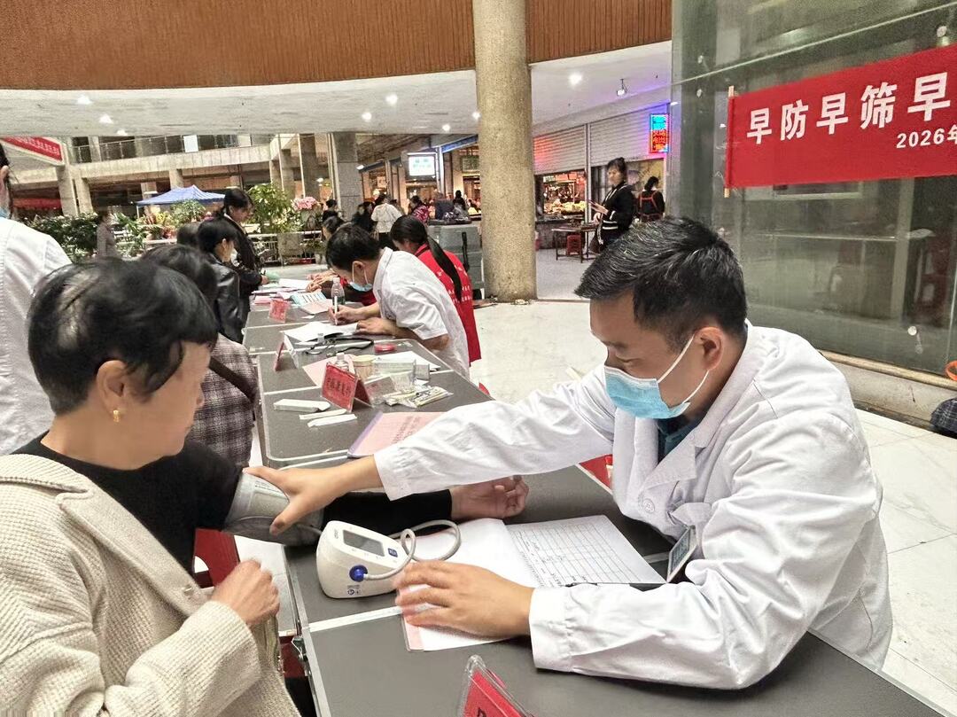 科普中,医护团队重点讲解肺癌、乳腺癌、宫颈癌、胃癌、结直肠癌等常见癌症的早期信号、高危因素及筛查要点,用通俗易懂的语言指导群众科学开展自我排查,纠正“癌症等于绝症”等认知误区。引导群众摒弃吸烟、酗酒、熬夜等不良生活习惯,养成科学健康的生活方式;倡导大家主动参与筛查,树立“预防为先、定期体检”的健康理念,做到早发现、早诊断、早治疗,筑牢自身健康防线。医护团队还为群众开展健康义诊,针对现场发现的健康异常情况及时给出专业指导。