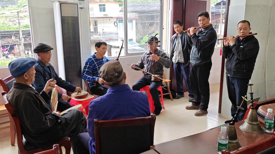 活动在激昂的唢呐合奏中拉开序幕。艺人们手持古朴唢呐,伴着铿锵锣鼓,鼓起腮帮、指尖翻飞,先后吹奏了《小堂红》《节节高》等传统曲牌,高亢明快的乐声瞬间点燃现场。随后进入苗乡特色的唱调环节。唱调在当地又称“苗调”,旋律或婉转或高亢,唱词多由村民结合日常劳作即兴创作。老艺人相继演唱了《开四门》《五庚金鸡》等经典调子,抑扬顿挫的古老腔韵与乐声相和,引得围观村民齐声叫好,纷纷举起手机记录。