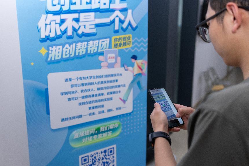线下问诊之外,线上接力同步启动。活动协办方湖南日报社通过“湘创帮帮团”平台,将当天的帮扶延伸至活动现场之外——学生扫码即可进入“随身顾问”通道,后续遇到新问题可随时提问,获得专家持续对接。