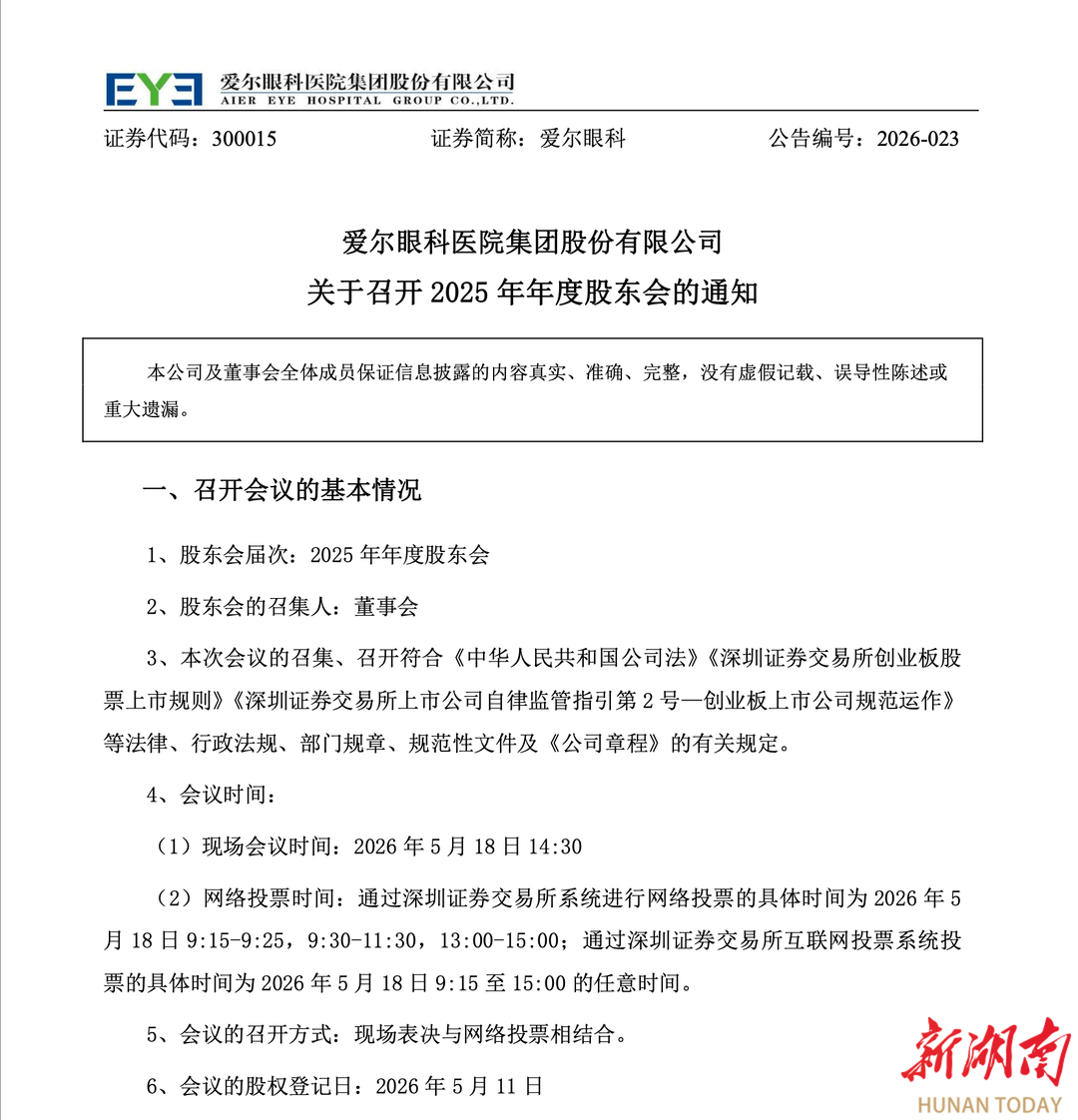 (爱尔眼科4月23日晚间发布公告。)