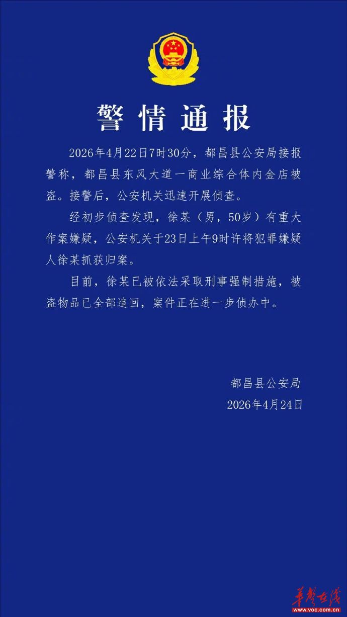 4月22日7时30分,都昌县公安局接报警称,都昌县东风大道一商业综合体内金店被盗。接警后,公安机关迅速开展侦查。