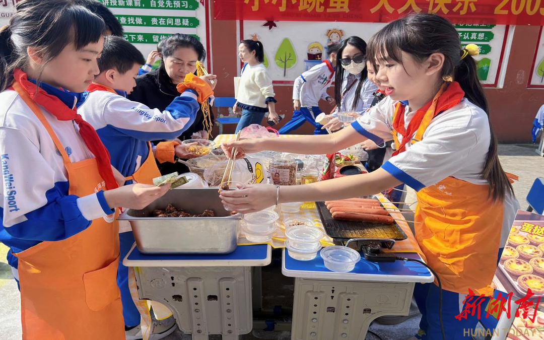 五年级、六年级的“劳动小市集”区域,多了一份“专业范儿”。除了常规的闲置物品交易,这里还出现了“特色小吃”摊位——家长们协助制作的龙虾面、手打柠檬茶被孩子们精心包装后摆上货架,吸引了不少“吃货”光顾。