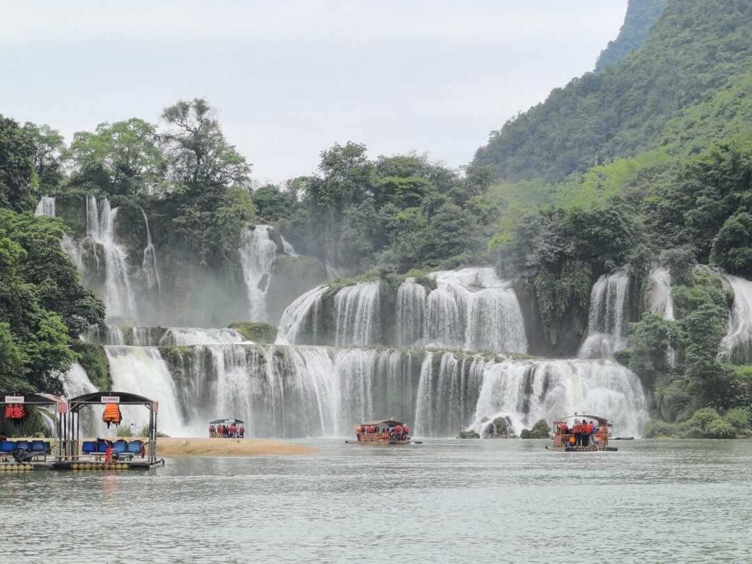 如果说前几日的行程是人文与历史的洗礼,那么第四站的德天瀑布之旅,则是大自然鬼斧神工的震撼展示。清晨,我们驱车前往大新县硕龙镇。未见其形,先闻其声,轰鸣之声如雷贯耳,震得山谷隐隐颤动。待转过山脚,德天瀑布的全貌赫然映入眼帘。这是一条横跨中越两国的跨国瀑布,三级跌落,气势磅礴。正值丰水期,河水奔腾而下,激起层层白雾,在阳光下折射出七彩霓虹。瀑布周围,翠竹掩映,木棉花开,中越边境的田园风光尽收眼底。我们乘坐竹筏缓缓靠近瀑布,水珠扑面而来,清凉沁脾,洗去了旅途的疲惫。看着那飞流直下的壮景,听着那震耳欲聋的水声,顿觉天地之辽阔,个人之渺小。德天瀑布,以它那排山倒海的气势,将“壮丽”二字诠释得淋漓尽致,让人在大自然的伟力面前肃然起敬,心神俱醉。