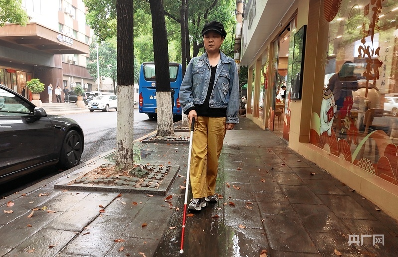 吴声湄使用盲杖出行(央广网记者黄珂岚 摄)