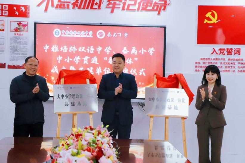 在全场热烈掌声中,中雅培粹双语中学党支部书记谢荣军军、泰禹小学党总支书记欧蓉,携手湖南师范大学马克思主义学院领导,共同为大中小学思政课一体化共建基地揭牌。牌匾熠熠生辉,思政共建落地生根,为学段融通、思政共育筑牢坚实根基。