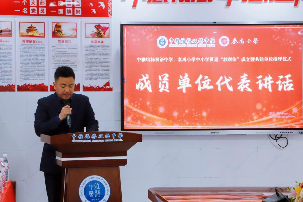 活动由中雅培粹双语中学校长王忠富主持,他首先代表两校全体师生,对各位领导、嘉宾在百忙之中拨冗莅临表示热烈欢迎和衷心感谢,随后宣读了中雅培粹双语中学、泰禹小学中小学贯通“教联体”共建单位名单。一份名单,承载着一份信任;一次携手,凝聚着一份力量,每一家共建单位的加入,都为两校学子的成长注入了新的动能,为协同育人之路增添了坚实力量。