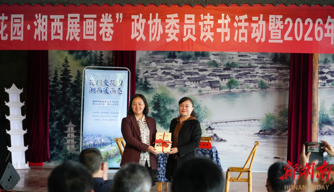 新湖南客户端4月24日讯(通讯员 田华 石健)4月23日,世界读书日,“花垣变花园·湘西展画卷”政协委员读书活动暨2026年第一期文史讲堂在湘西土家族苗族自治州花垣县边城镇举行。州政协主席向邦伟出席并讲话。州政协副主席邓建英、宋维金、李志平、彭军参加。