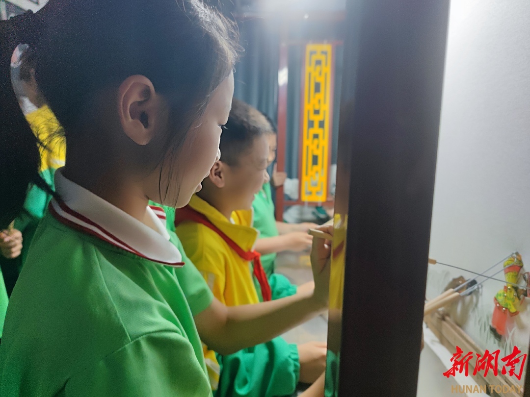 石门县楚江街道闫家溶完全小学的美术室里,幕布亮起,桩巴龙翻腾游走,农家女掩面哭泣,一群孩子屏息凝神地操纵着皮影杆。这所城郊小学以省级非遗项目《桩巴龙的传说》为蓝本,让湘北民间的孝龙故事在光影中复活。自2023年成立皮影社团以来,学校邀请传承人进校授课,将皮影技艺深度融入“双减”课后服务,孩子们从雕刻、上色到操控、配乐,系统学习全套传统技艺,并创编了《王尔琢的故事》等本土剧目。