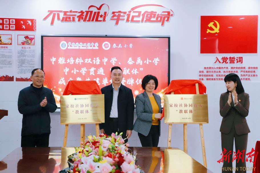 新湖南客户端4月24日讯(通讯员 陈奕婷)暮春四月,万物向新;同心聚力,共育未来。4月23日下午,中雅培粹双语中学、泰禹小学中小学贯通“教联体”成立暨共建单位授牌仪式在中雅培粹双语中学举行,30余家共建单位代表、学校领导、教师及家长代表齐聚一堂,共商育人大计,共启协同新篇。