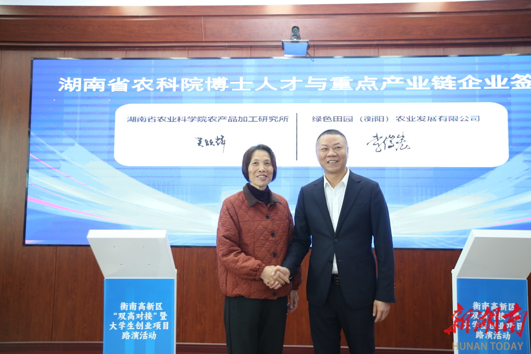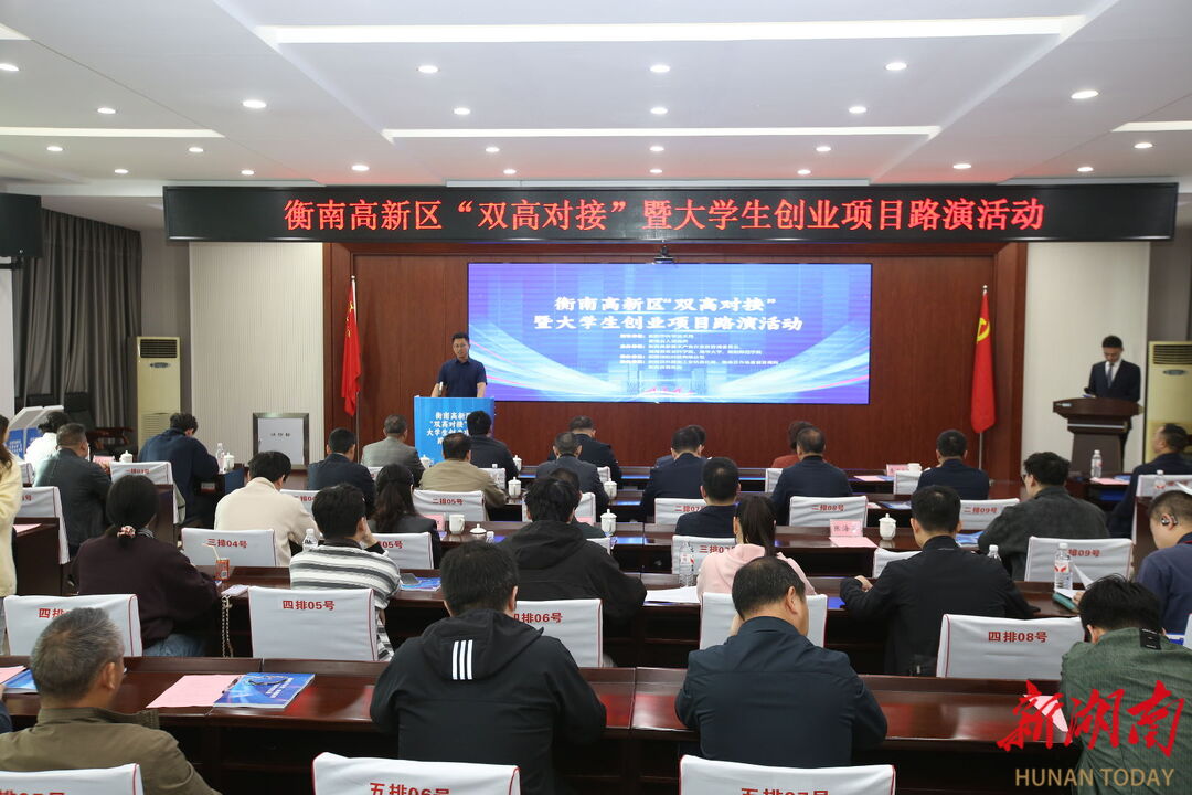 湖南日报·新湖南客户端4月24日讯(通讯员 柳镭)为深化产学研融合,推动高校创新资源与园区产业需求精准对接,吸引青年人才扎根园区创新创业,4月24日,衡南高新技术产业开发区“双高对接”暨大学生创业项目路演活动成功举办。活动由衡南高新区管委会、湖南省农业科学院、南华大学、衡阳师范学院联合主办,衡阳市科技局、衡南县人民政府指导,汇聚高校专家、青年学子、企业代表等60余人,共话创新、共谋合作、共促发展。