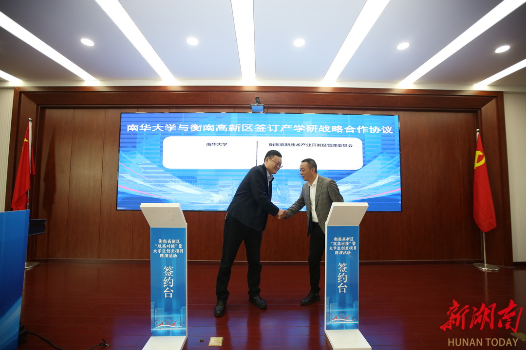 活动现场,衡南高新区与南华大学签订战略合作协议,湖南省农科院、南华大学、衡阳师范学院博士人才团队与园区重点产业链企业达成多项技术合作,南华大学大学生创业指导工作室与衡南高新区同步签约,通过“园区+企业+高校”“导师+学生+孵化载体”创新模式,搭建起科技成果转化、人才引育、项目孵化的高效平台。