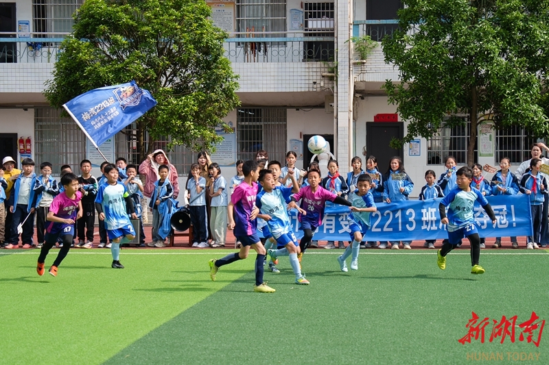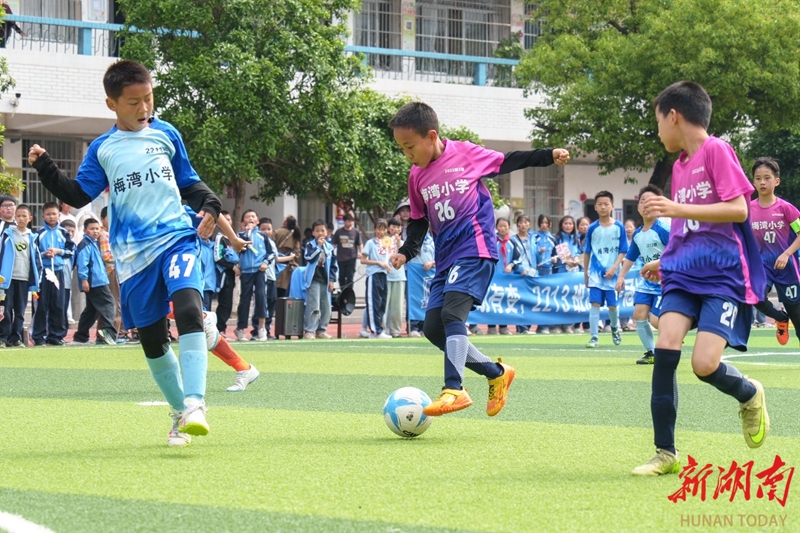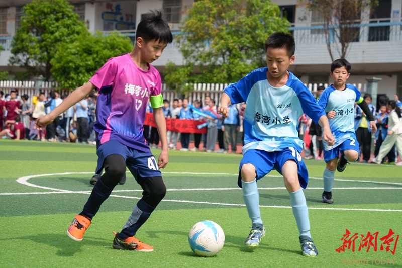 4月24日,永州市冷水滩区梅湾小学,学生在班级足球联赛上奋力拼抢。近年来,该区大力推进校园足球发展,通过开展足球教学、成立社团、举办足球联赛等方式,让学生在足球运动中快乐成长、增强体质、磨砺意志。雷中祥 摄(湖南图片库)