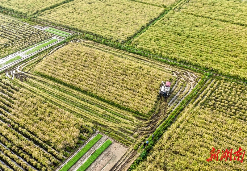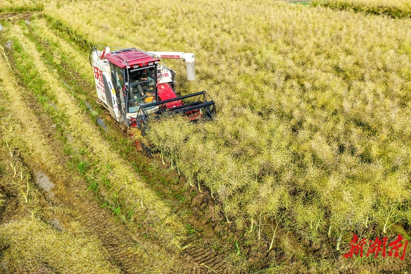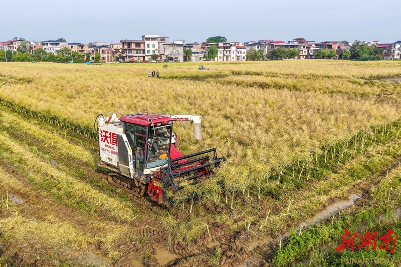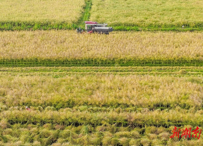 4月24日,道县蚣坝镇光家岭村,农机手驾驶农机在田间收割油菜。近日,当地种植的油菜进入收获期,农民抢抓农时,收获油菜。近年来,该县充分利用地理气候优势,大力推广“油稻稻”三熟制水旱轮作,实现农田增效、农民增收。蒋克青 摄(湖南图片库)