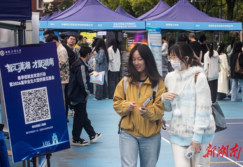 4月24日,湖南工商大学学生在现场了解企业信息。当天,“智汇潇湘 才聚湖南” 春季促就业攻坚行动暨湖南工商大学2026届毕业生大型供需见面会举行。200余家行业领军企业齐聚校园,提供6000余个岗位,吸引2000余名学子前来求职。活动以政企校联动模式畅通求职渠道,为毕业生择业保驾护航,积极引导青年留湘扎根、逐梦前行。 湖南日报全媒体记者 赵持 通讯员 涂画 王栩君 摄影报道