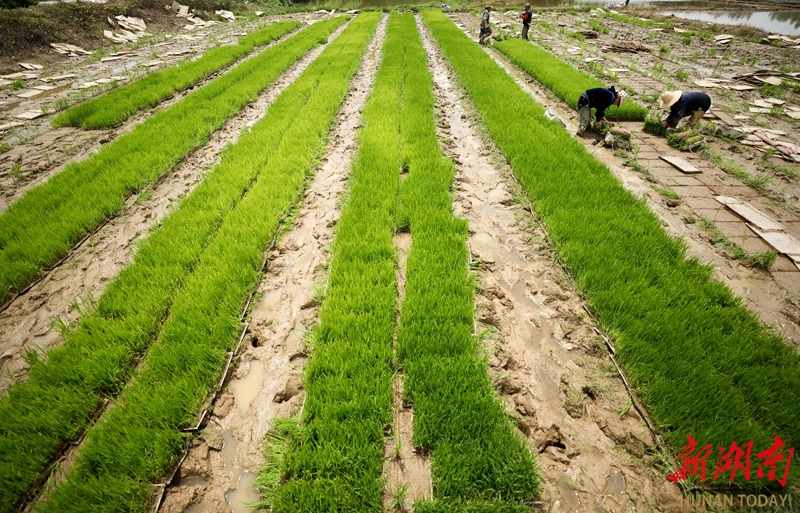 4月24日,资兴市唐洞街道镜塘村,农民在育秧田里起秧盘。近年来,该市持续加大粮食生产奖补力度,大力推广早稻集中育秧和机械化插秧,扩大双季稻种植面积,全力夯实粮食稳产增产基础。李科 李铁南 摄影报道(湖南图片库)