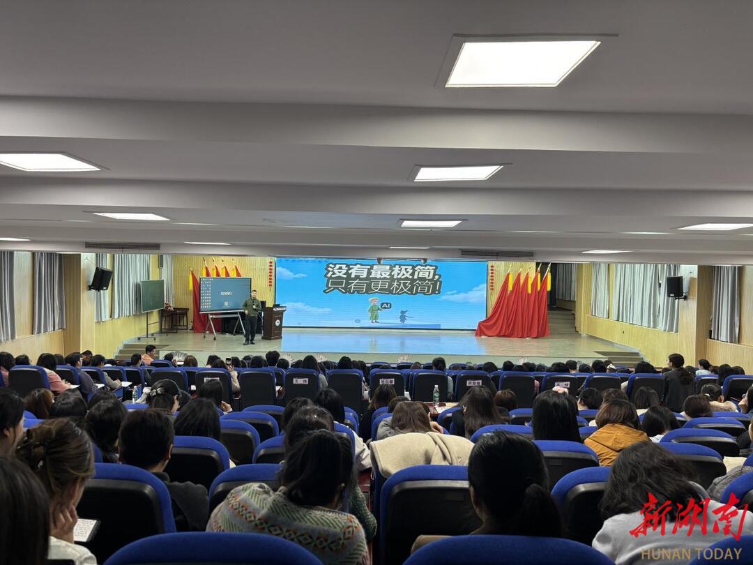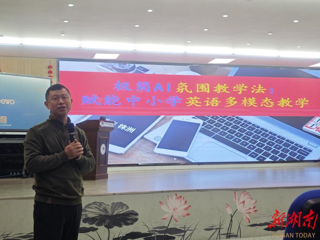 新湖南客户端4月25日讯(通讯员 刘洁)暮春启新思,教研赋新能。近日,湘潭市雨湖区中小学英语教师全员培训在九华金庭莲城小学举行。本次培训以“智启未来,中小学英语教学新引擎”为主题,特邀湖南省国培省培专家团成员何其钢老师授课,带来《极简 AI 三阶氛围教学法:生成式 AI 赋能英语教学全场景应用》专题分享,全区中小学英语教师齐聚参训,共探 AI 时代英语教学的创新发展路径。