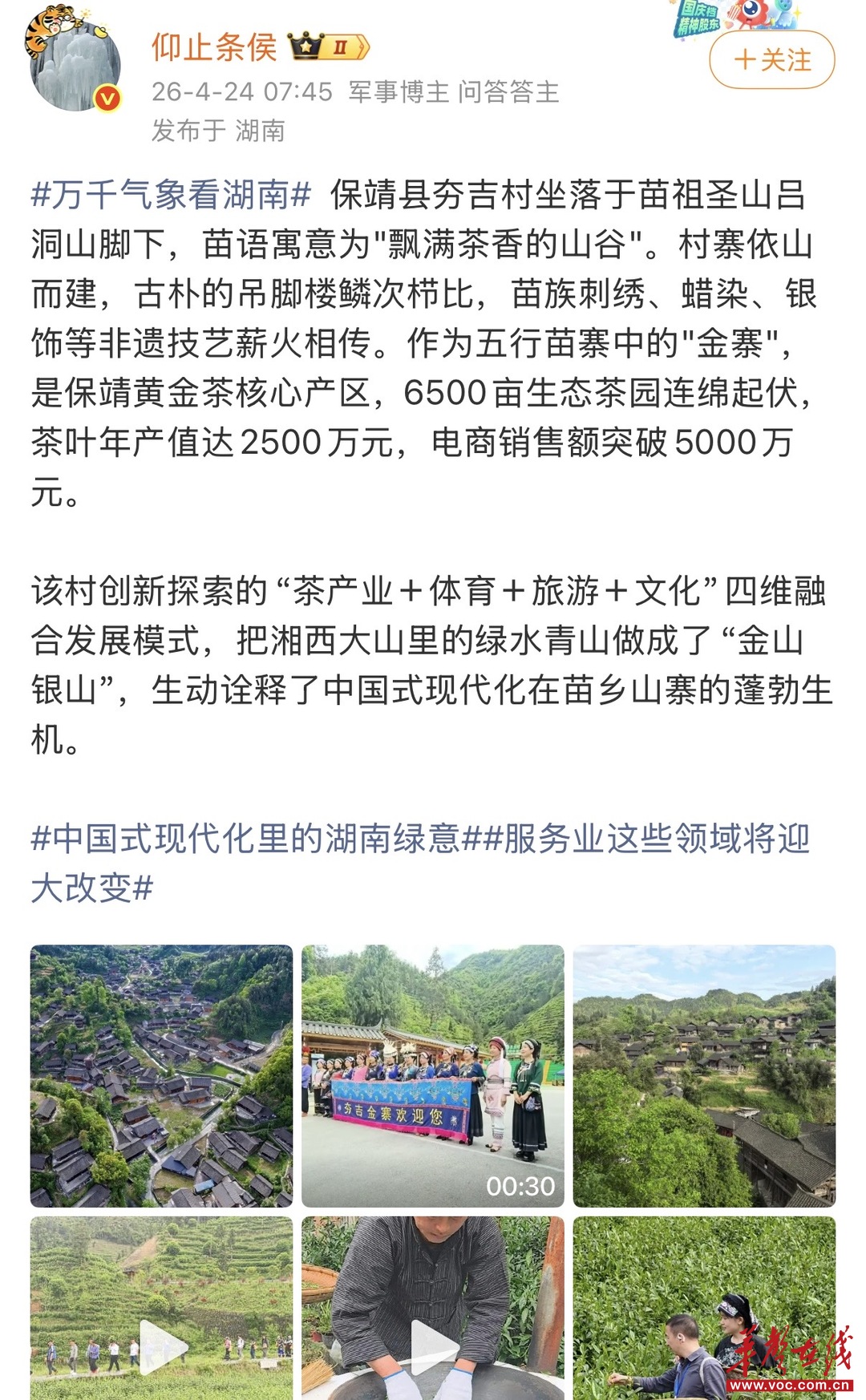 @仰止条侯 配图古朴的苗寨风貌,并在博文中写道:“把湘西大山里的绿水青山做成了‘金山银山’,生动诠释了中国式现代化在苗乡山寨的蓬勃生机。”
