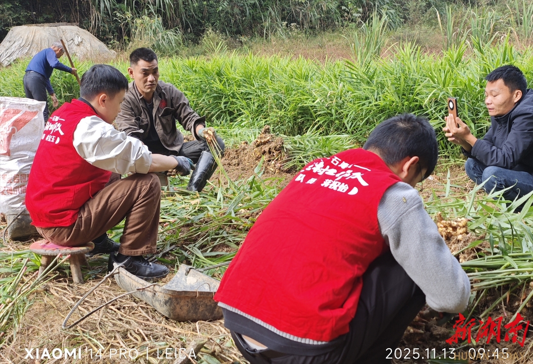 工作队帮助村民采收生姜,并现场进行网上推销。