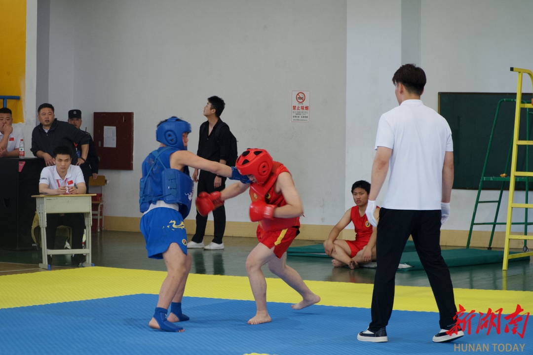 散打赛场更是精彩纷呈,作为允许拳、腿、摔结合的竞技项目,对抗性十足。只见一名蓝方选手干脆利落将红方掀翻在地,裁判立刻趴下挥手示意得分,场边叫好声不断。爬起来的少年目光依旧坚毅,迅速重新进入对峙状态。