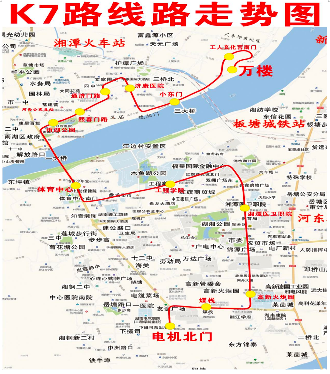 调整后:合并旅游2号、5号公交专线为K7公交快线,线路始发万楼首末站,沿途停靠沿江中路(工人文化宫南门、小东门)、观湘门路(济康医院)、通济门路(通济门路)、熙春门路(熙春门路)、雨湖路(雨湖公园)、建设中路(体育中心)、福星中路(工程学院)、双拥中路(湘潭医卫职院)、双拥南路(高新火炬园)、书院中路(煤栈)、电工南路(电机北门)至下摄司枢纽站(暂停靠电机北门)。