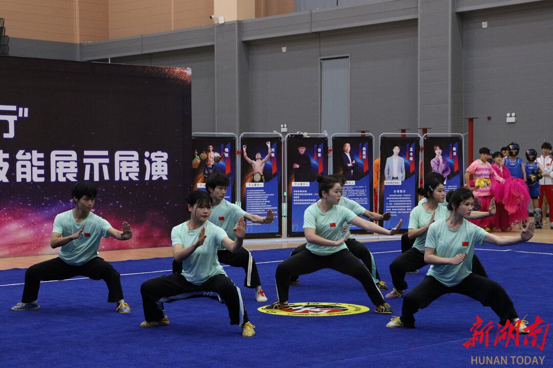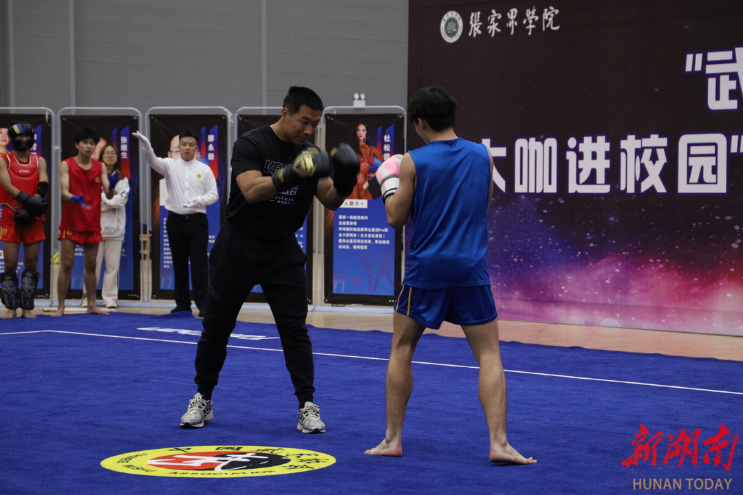 技能展演环节在体艺馆开展,国家一级健美裁判、高级营养师杜松霞,散打搏击名将韩文豹、刘策等行业大咖,张家界学院党委书记鲁荣波,副校长王常峰、向江等参加活动。