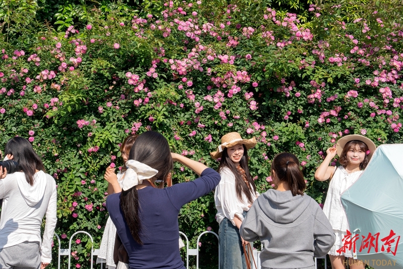 4月25日,湖南烈士公园,娇艳动人的蔷薇花海氛围感十足,吸引不少市民前来拍照打卡。暮春时节,蔷薇花悄然进入盛花期,成片蔷薇藤蔓蜿蜒舒展,粉嫩、红艳的花朵层层叠叠,缀满枝头,勾勒出浪漫温柔的春日景致。 湖南日报全媒体记者 李健 摄