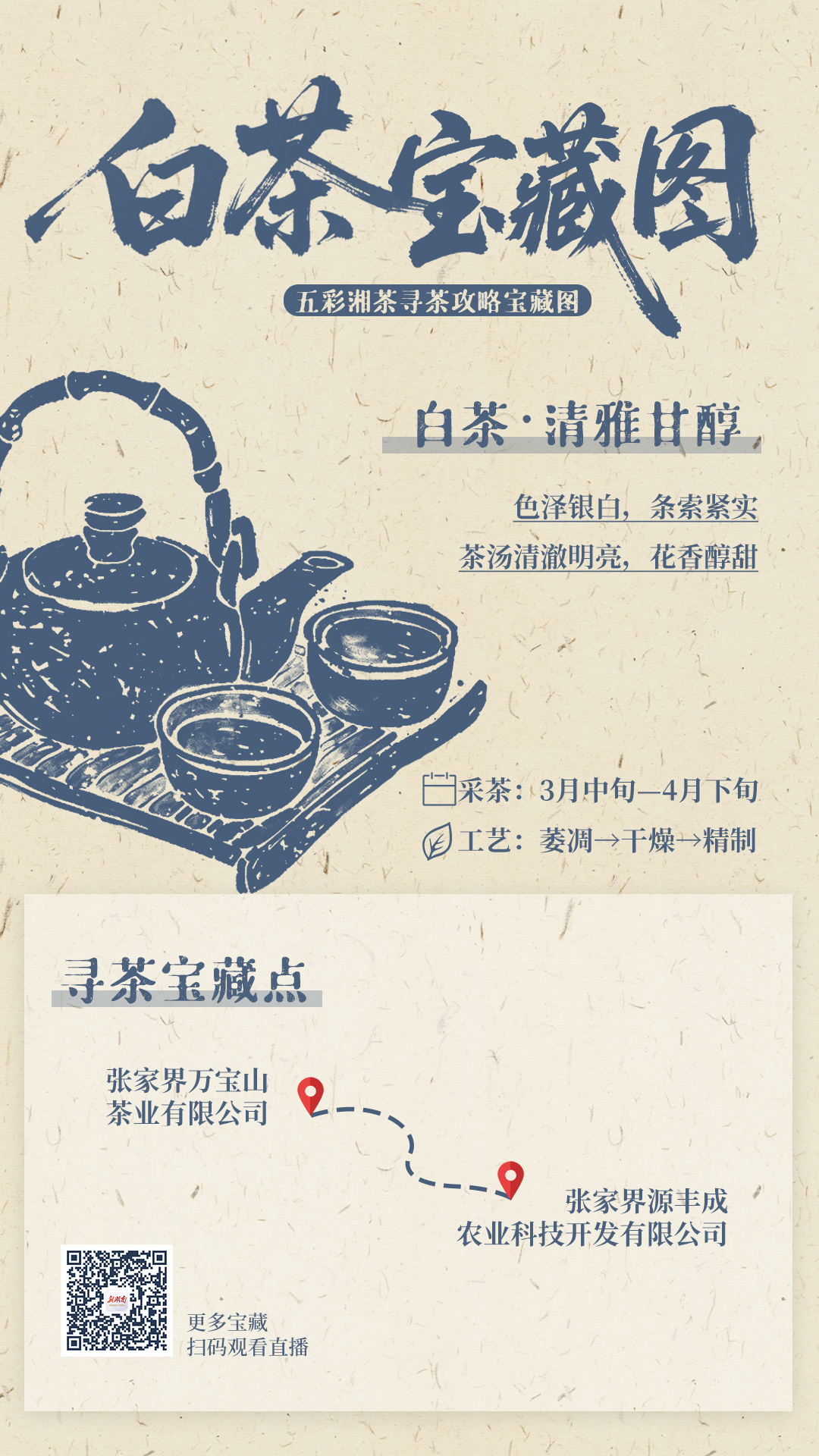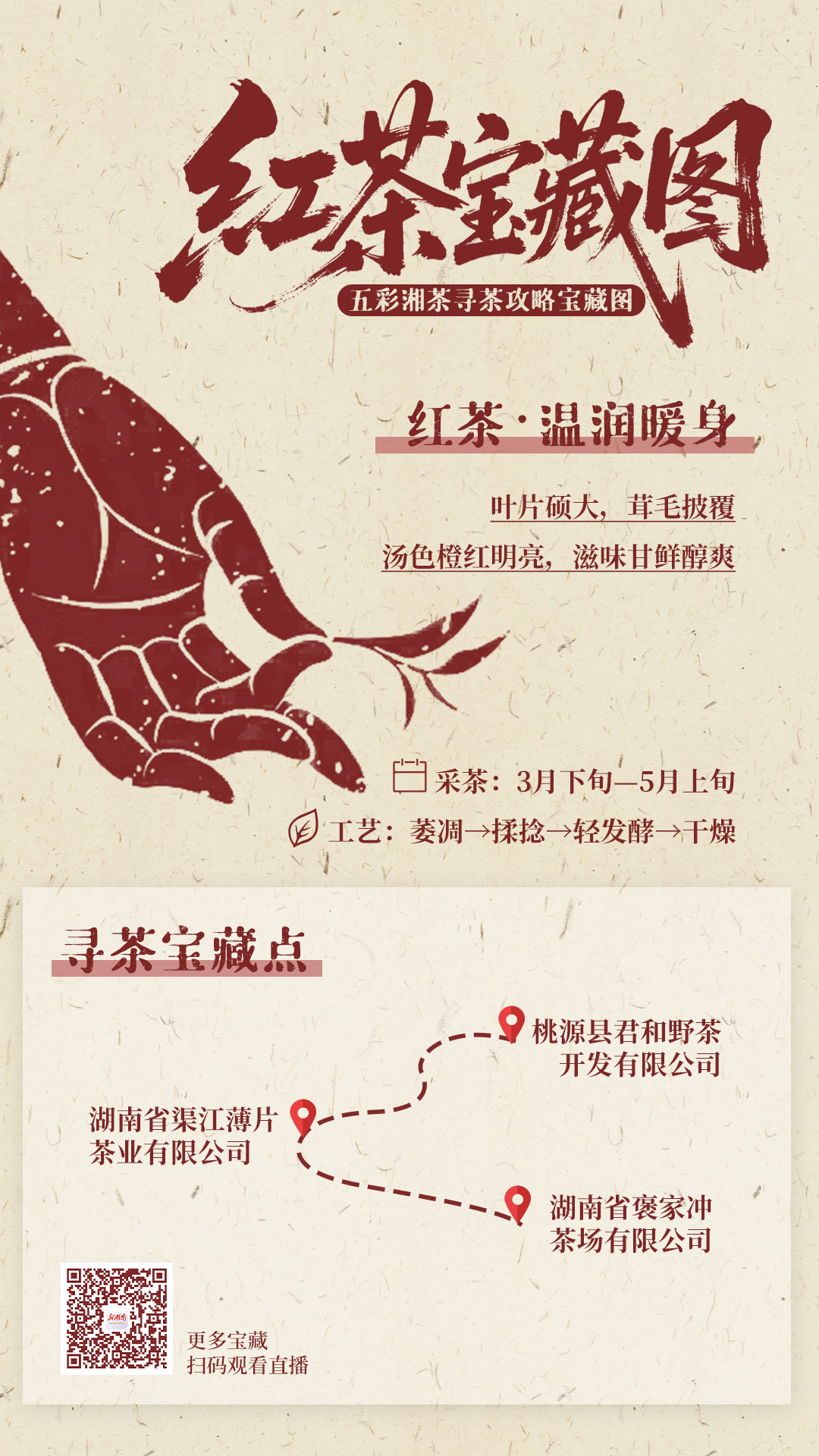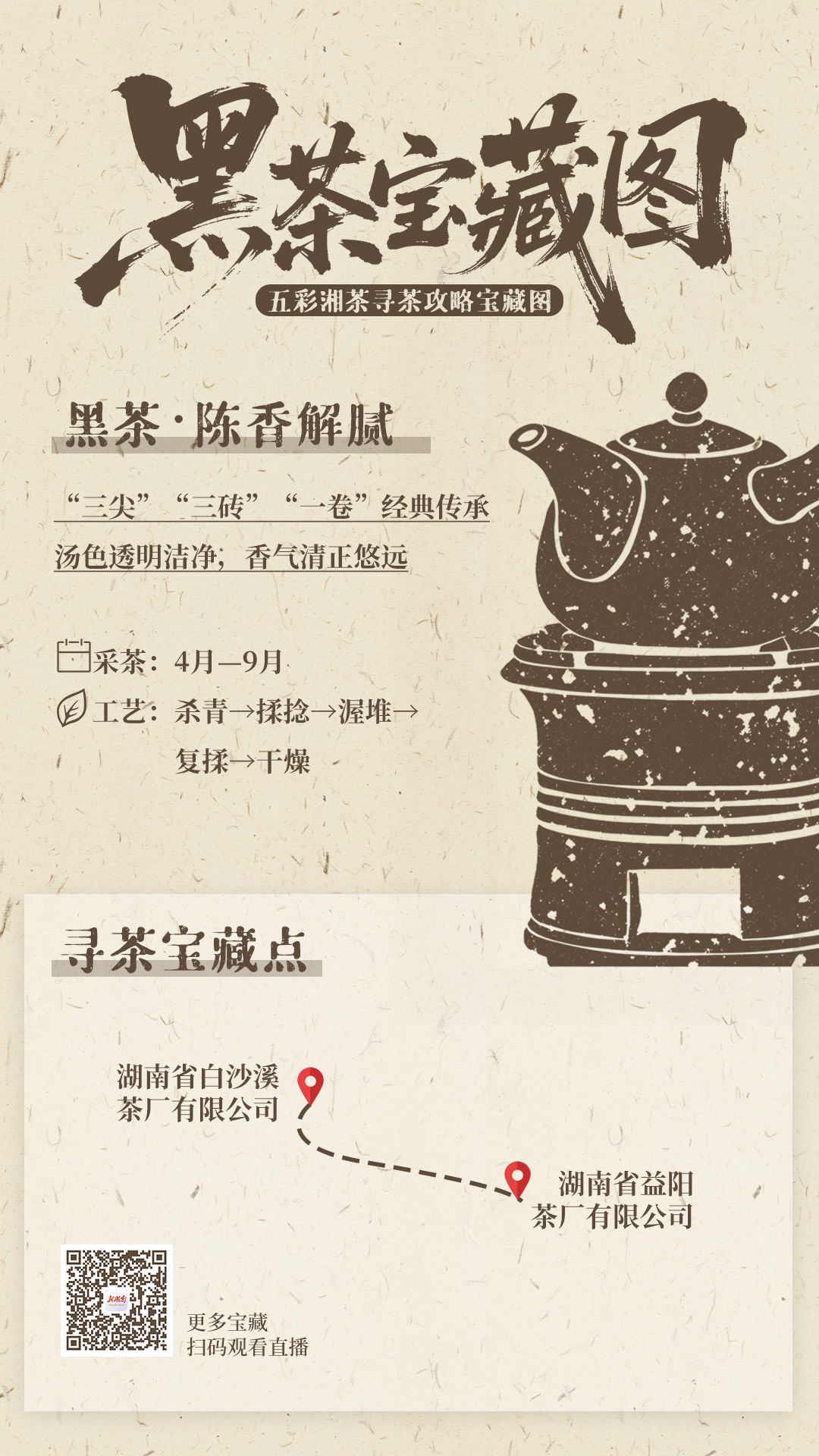 湖南人爱喝茶,但你喝对了吗?红茶温润暖身,黑茶陈香解腻,白茶清雅甘醇,黄茶醇和温润,绿茶鲜爽回甘。新湖南客户端为你绘制了一份“五彩湘茶寻茶攻略宝藏图”,五大茶类、十六家茶企,采茶时间、制作工艺、宝藏点位,一图掌握。4月28日09:00起,锁定新湖南直播,10小时云端茶旅,百份五彩茶礼等你来抽!