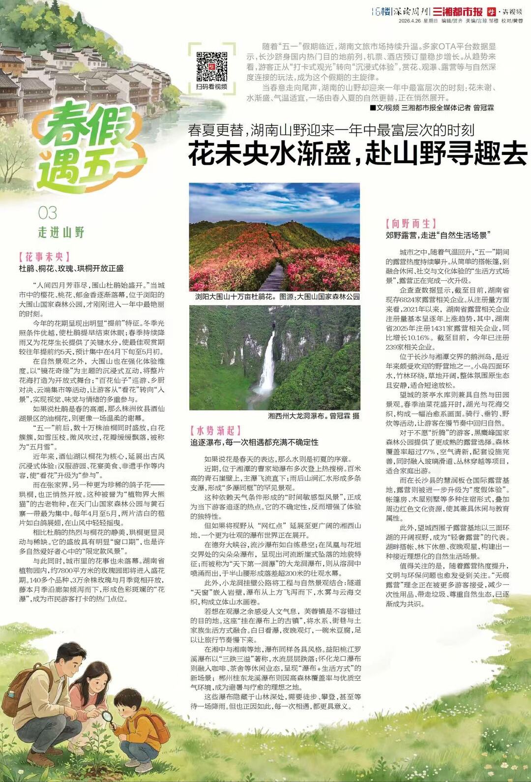 当然,也有不少家庭转向山野乡村,露营、溯溪、农场体验成热门选择。湖南春夏之交,杜鹃盛放、桐花漫野,瀑布因雨水更显磅礴,自然场景带来的松弛感,让孩子在田野里奔跑,家长在篝火旁放松,亲子关系在烟火气中悄然拉近,旅行更像“过生活”。
