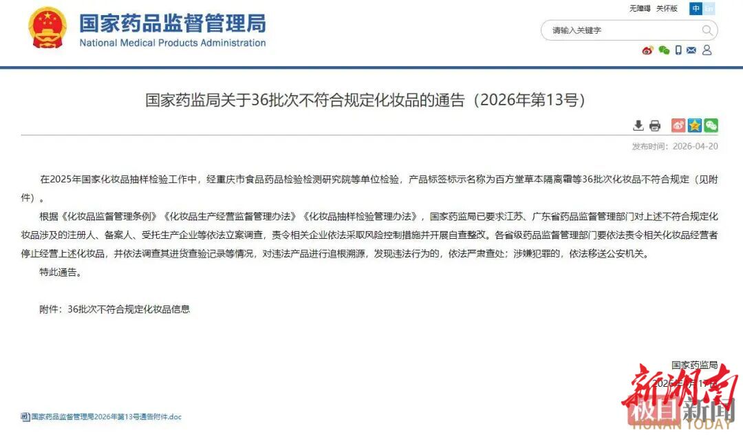 4月20日,国家药监局官网发布《关于36批次不符合规定化妆品的通告(2026年第13号)》,36批次不符合规定化妆品覆盖隔离霜、面膜、防晒产品、染发膏、洗发产品、沐浴露、足浴粉等七大品类。