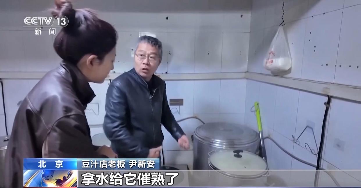 豆汁店老板 尹新安:因为这里套着桶,两桶之间是水,靠水给它催熟了,水的温度怎么也不超过100℃。