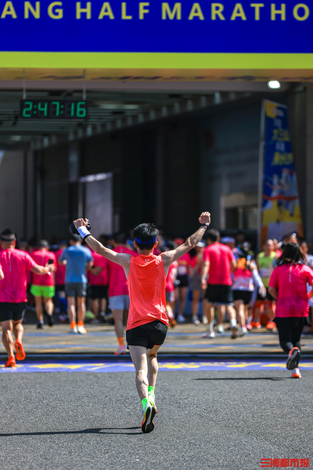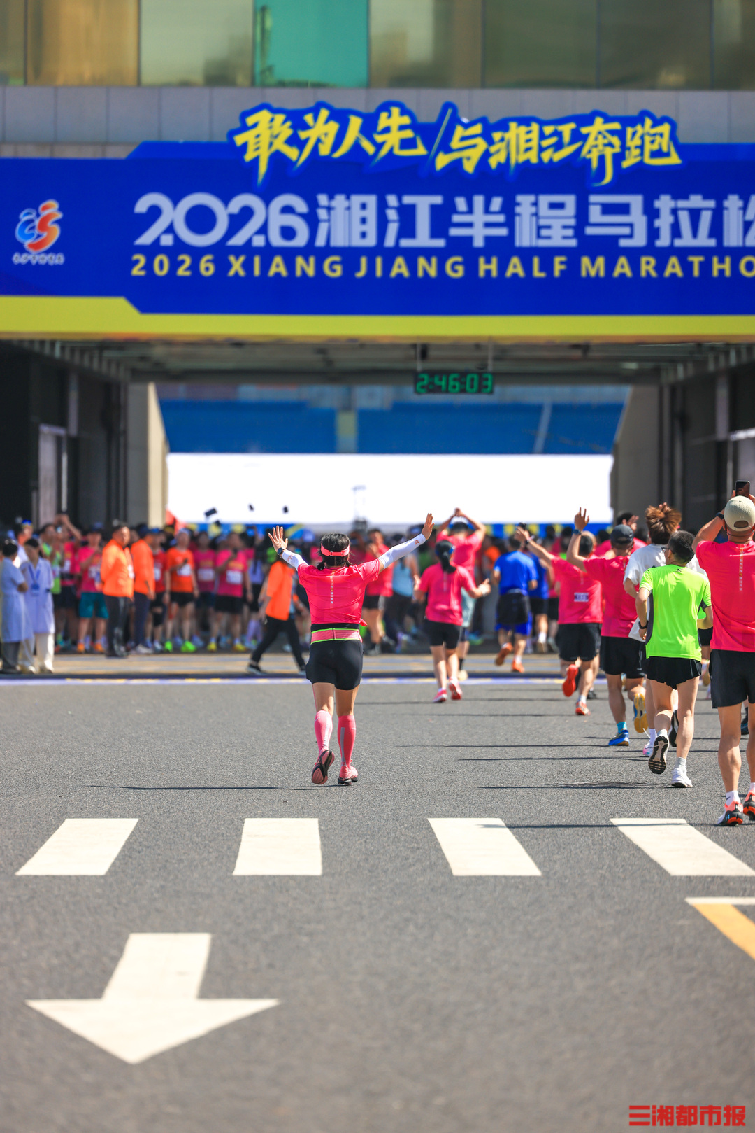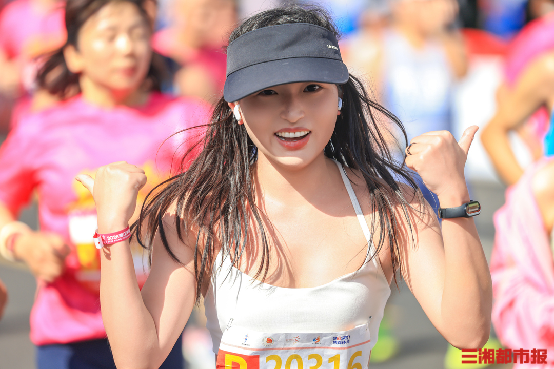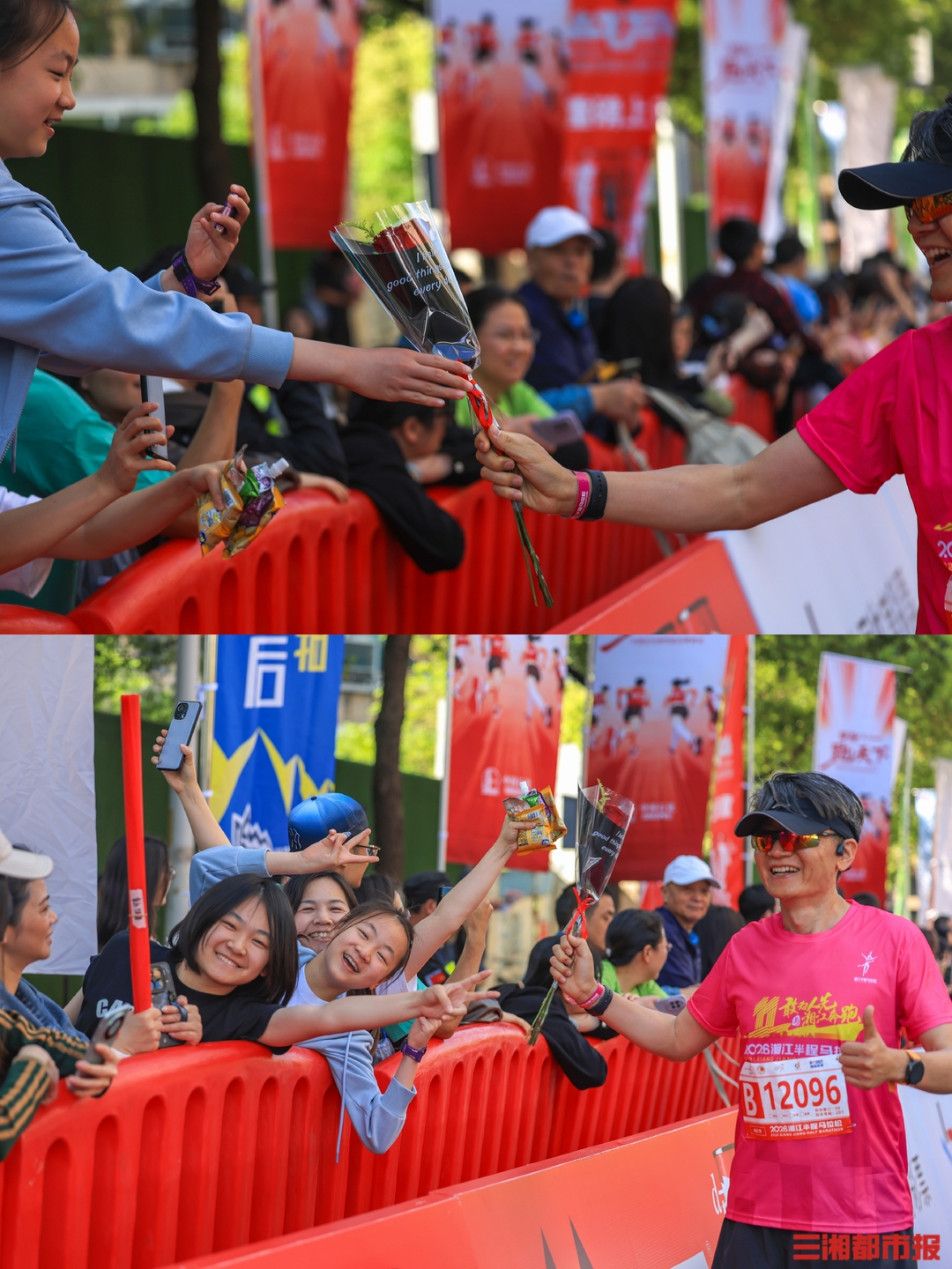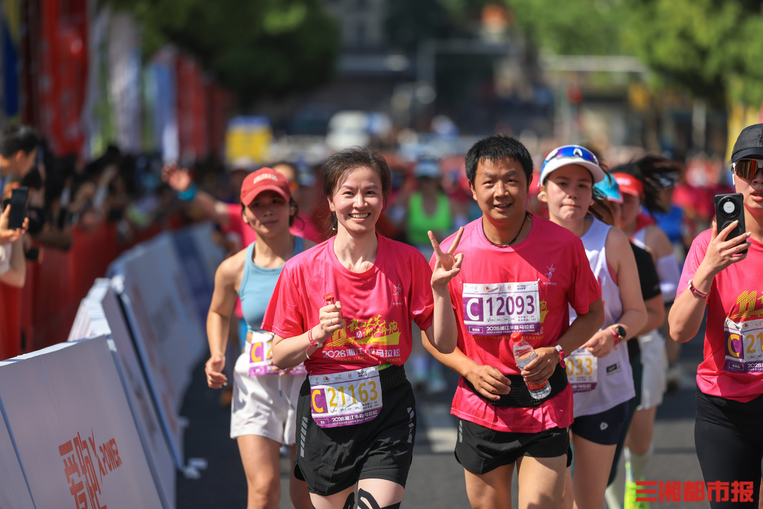 4月26日清晨7时,2026湘江半程马拉松在长沙贺龙体育场南门正式鸣枪开赛。作为连续成功举办十一届的城市经典路跑赛事,15000名跑友齐聚湘江岸,身着粉红色参赛服,以奔跑致敬春日,沿途市民的加油声和他们的步伐同频。在终点,等待跑友们的是祝贺,是鲜花,是掌声。(刘丰 叶竹 摄)