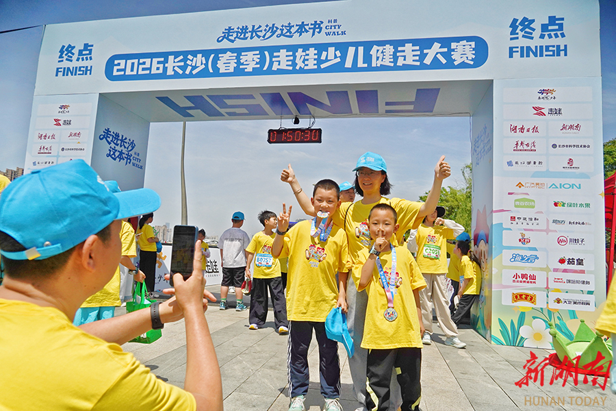 4月26日上午,到达终点后,家长和小孩共同合影留念。当天,由湖南日报社主办的2026长沙(春季)走娃少儿健走大赛火热开赛。赛事以“走进长沙这本书”为主题, 3500组家庭从鸭嘴公园出发,沿浏阳河步道徒步至隆平水稻博物馆,途经马王堆、汉桥等地,在运动中感受城市人文魅力。湖南日报全媒体记者 徐行 摄