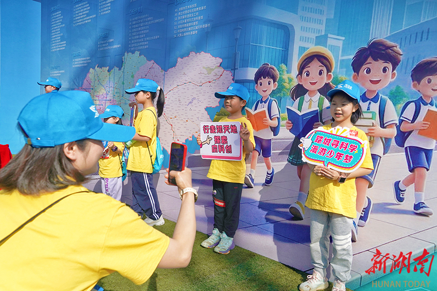 4月26日上午,小朋友在拍照打卡。当天,由湖南日报社主办的2026长沙(春季)走娃少儿健走大赛火热开赛。赛事以“走进长沙这本书”为主题, 3500组家庭从鸭嘴公园出发,沿浏阳河步道徒步至隆平水稻博物馆,途经马王堆、汉桥等地,在运动中感受城市人文魅力。湖南日报全媒体记者 徐行 摄