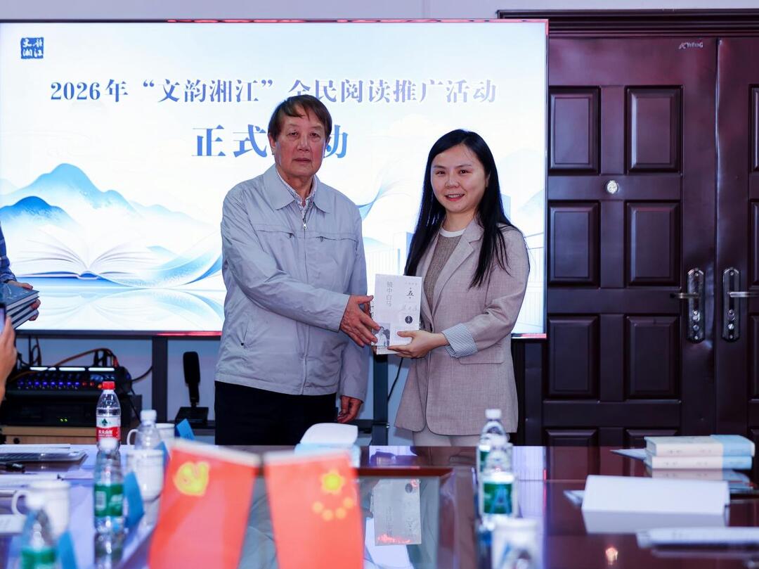 随后,“文韵湘江”全民阅读活动正式启动。活动现场,一批作家、诗人、学者向湘江新区(岳麓区)图书馆捐赠了主题读物:中国诗歌学会原副会长、湖南省诗歌学会创始会长梁尔源捐赠《镜中白马》,中南大学红色文化创作与研究中心主任聂茂赠送《王船山》,湖南省作协副主席吴茂盛带来《江河大地》,湖南省网络作协主席余艳赠送《与鹤一起飞》,湖南省播音主持研究会赠送曾致、何帅主编的《中华经典诵读》,以及荣斌主编的《诗歌长沙》等。