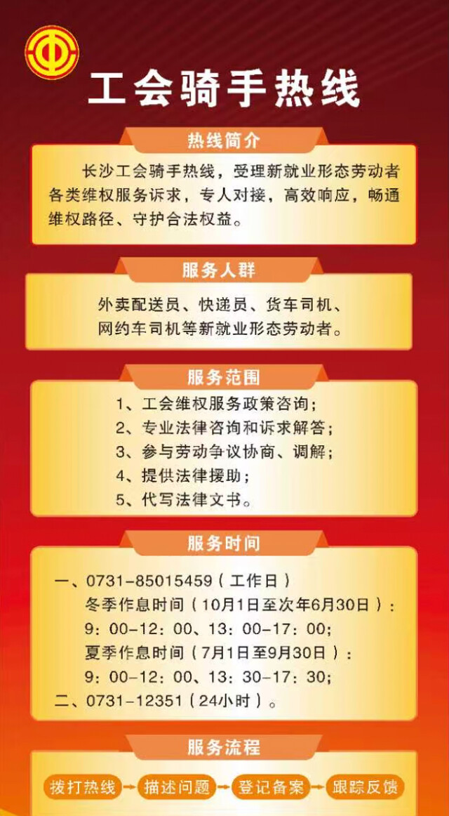 湖南日报4月26日讯(全媒体记者 彭雅惠)权益有保障、就医不跑腿。今天,湖南工会从长沙地区试点,为“骑手”上线双重福利:开通专线维权热线 0731-85015459,在长沙市中心医院开通专门就医优先通道。依托工会驿站服务网络,湖南工会不断探索构建“15分钟服务圈”,从法律、生活、就业、健康、文体等方面推进新就业形态群体服务精准化。