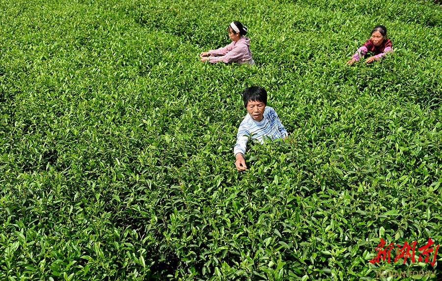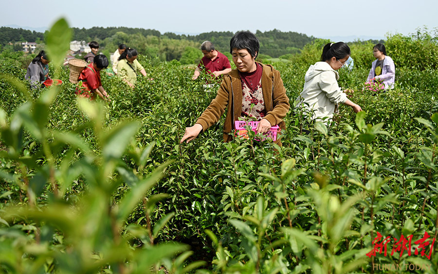 4月26日,洞口县茶铺茶场管理区半山茶园,茶农在采摘茶叶。近年来,该县充分发挥富硒生态优势,大力发展茶产业,通过完善产业链条促进农民增收,让茶叶真正成为乡村振兴的“金叶子”。 滕治中 摄(湖南图片库)