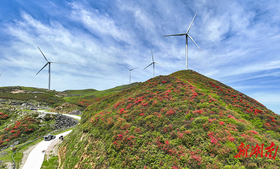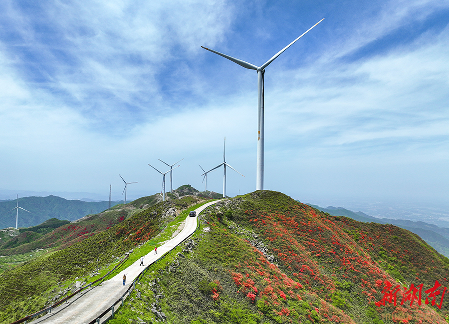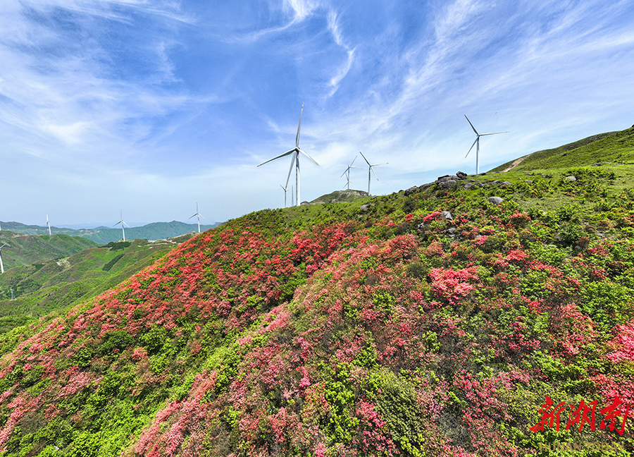 4月26日,桂阳县天塘山,绚丽的杜鹃花海与巍然耸立的白色风车构成红白相映的独特景致。近年来,该县充分发挥风、光资源优势,推动新能源与传统能源多能互补,大力发展风电、光伏等清洁能源与乡村旅游深度融合,为乡村振兴注入新动能。 周秀鱼春 摄(湖南图片库)
