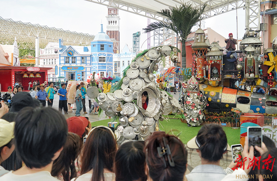 4月26日,长沙世界之窗开启五一“马栏山街头艺术节”活动。活动涵盖“废物时装秀”、“破铜烂铁”打击乐、敦煌飞天高空大秀、爆笑武侠熊猫默剧秀等多元艺术形式,还有厦门先锋艺术厂牌《狂荒之地》音乐大篷车长沙首展,吸引了众多市民和游客参与互动。 湖南日报全媒体记者 徐行 通讯员 邓婷 摄影报道