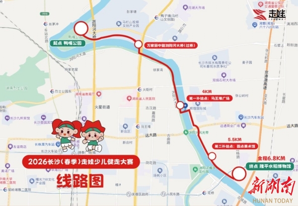 本次路线全程6.8公里,串联马栏山鸭嘴公园、万家丽路浏阳河大桥、马王堆广场、汉桥、圆点美术馆、隆平水稻博物馆等多处城市文化地标。起点、终点及两处核心补给点均设置主题科普展示区、趣味答题区、亲子互动区,一站一特色。