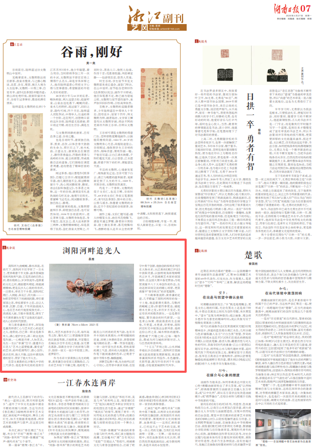 浏阳河九曲蜿蜒,静水深流,名扬天下。浏阳河不仅孕育了一方水土,更承载着千年文脉,涵养星城独有的风致和气韵。它是灵动的自然之河,碧水绕青山,岁岁伴流年;是厚重的文化之河,湘韵楚风绵延,铸就湖湘精神;更是长沙人心底的母亲河,一汪碧水,牵系万千乡愁。浏阳河汇湘江、入洞庭、奔长江、向大海……一如那首传唱天下的湖南民歌,牵引着家国之思,牵挂着家乡之恋,总让人欢喜、沉醉、自豪。千年河韵浸润人心,也在艺术的天地里绽放光彩。一湾清流入画,万般乡情落笔,便有了今天黄承谦先生笔下这卷流光溢彩、动人心弦的时代图景。